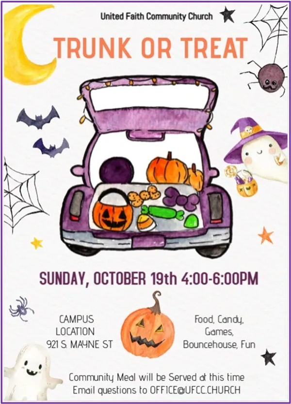 Please mark your calendars for the 3rd Annual Trunk or Treat on Sunday, October 19th from 4:00 PM - 6:00 PM.